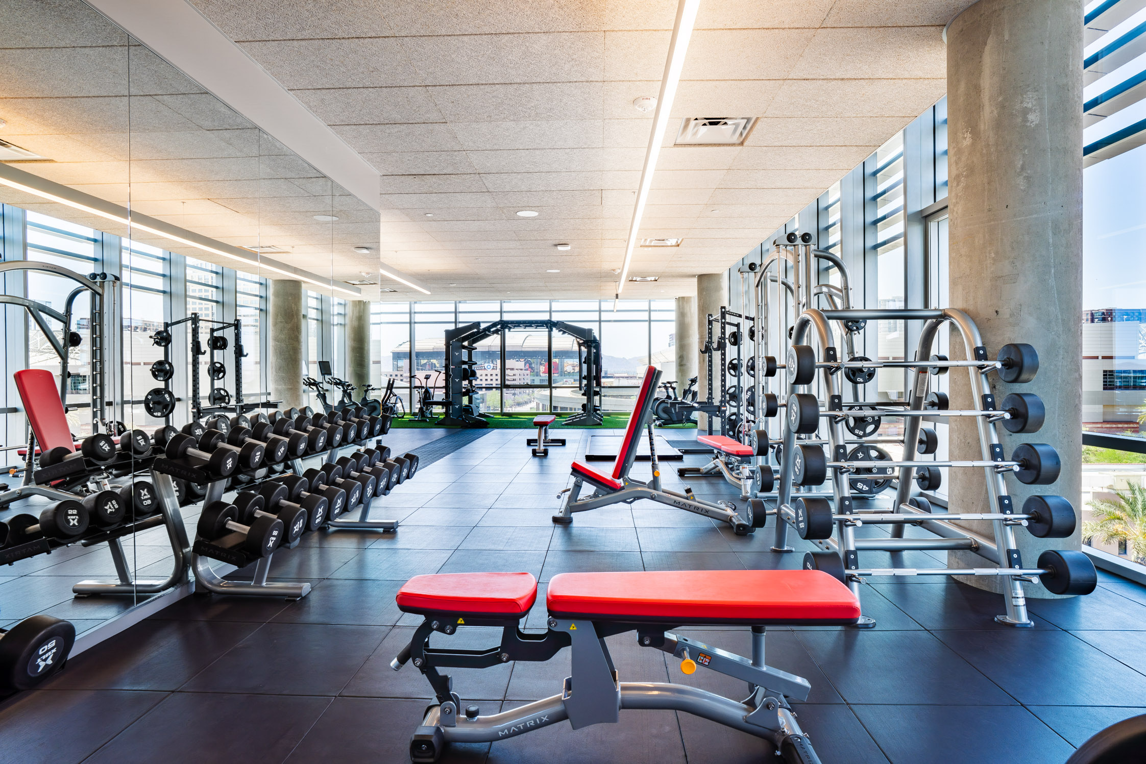 - State-of-the-art fitness center with treadmills, stair machines, ellipticals, exercise bikes, and free weights